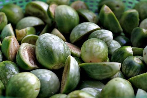 Cà đắng vốn là loại cà mọc dại. Sau được người dân đem về trồng và tạo ra một giống cà đắng ít đắng hơn. Cà có quả thon dài, trái có vằn dọc trắng xanh như trái dưa. Vị cà đắng đăng đắng như khổ qua rừng rất hấp dẫn. Người trong buôn thường dùng cà để nấu canh, kho cá khô hoặc kho tép. Món ăn nào cũng đặc trưng vị đắng, vị cay khiến ai ăn một lần cũng muốn dùng nữa.