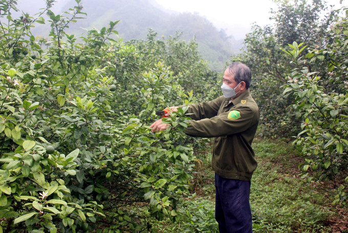 Ông Hoàng Văn Biệt ở điểm di dân tái định cư thôn Mường, xã Phù Lưu, huyện Hàm Yên chăm sóc vườn chanh, phát triển kinh tế hộ gia đình. Ảnh: Vũ Quang Đán