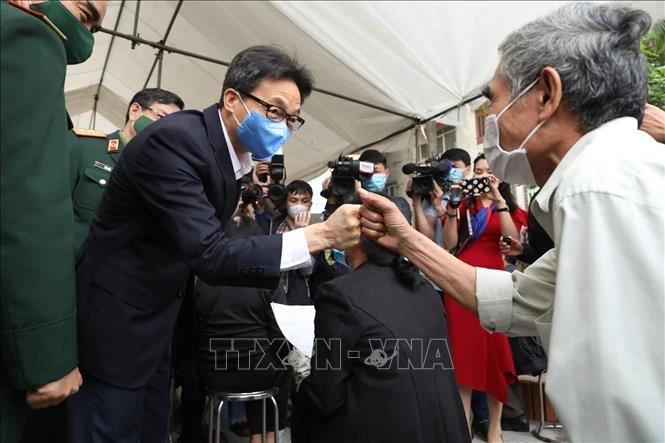 Phó Thủ tướng Vũ Đức Đam đến thăm và động viên tình nguyện viên và cán bộ trường Học viện Quân y trong đợt tiêm thử nghiệm đợt 2. Ảnh: Minh Quyết - TTXVN