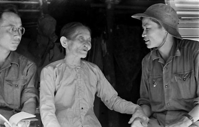 Phóng viên Thanh Phong của TTXGP tại Quảng Trị (bên phải) nói chuyện với một gia đình nuôi cán bộ cách mạng tại thị xã Quảng Trị năm 1968. Ảnh: Tư liệu TTXVN