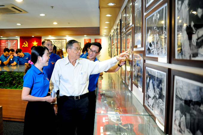 Nhà báo Nguyễn Thanh Bền cùng đoàn viên, thanh niên tham quan những hình ảnh chiến trường xưa của phóng viên TTXGP được trưng bày tại phòng truyền thống Cơ quan TTXVN khu vực phía Nam. Ảnh: An Hiếu