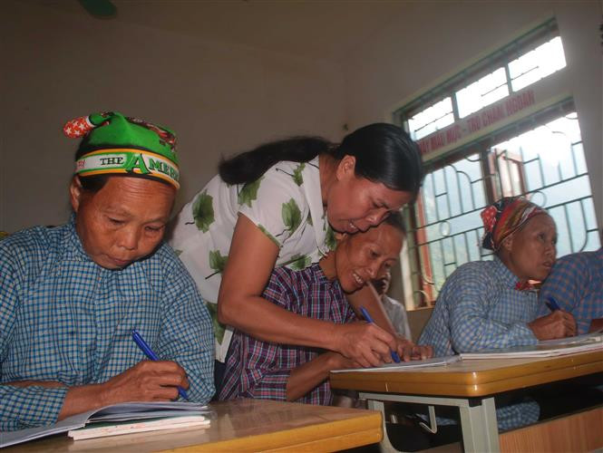 Cô giáo hướng dẫn học viên viết chữ tại lớp xóa mù chữ ở Lũng Chuống, xã Nội Thôn, huyện Hà Quảng, tỉnh Cao Bằng. Ảnh: Chu Hiệu - TTXVN.
