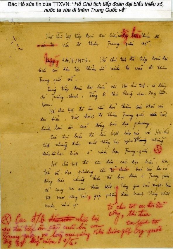 Dù bận trăm công nghìn việc, hằng ngày, Bác vẫn dành thời gian nghe đài, đọc bản tin của VNTTX. Bác đã nhiều lần tự tay sửa từng câu, từng từ, duyệt tin bài, căn dặn về nghề với phóng viên VNTTX. Trong ảnh: Bút tích Bác Hồ sửa tin của TTXVN. Ảnh: Tư liệu TTXVN