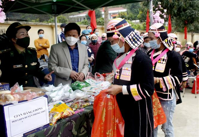 "Gian hàng 0 đồng" trong chương trình “Xuân Biên phòng ấm lòng dân bản” đã giúp bà con xã Huổi Luông nhận được nhu yếu phẩm để chuẩn bị đón Tết. Ảnh: Đinh Thùy - TTXVN