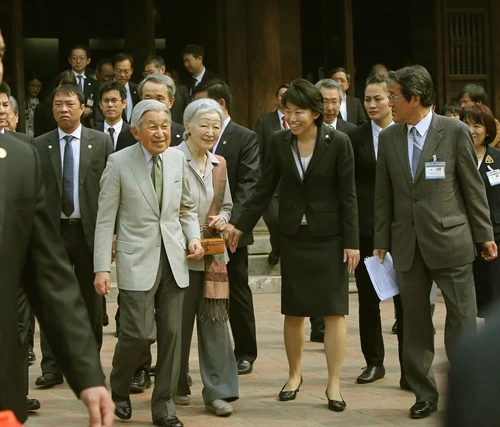 | Trong khuôn khổ chuyến thăm cấp Nhà nước Việt Nam từ ngày 28/2 – 5/3/2017, sáng 2/3, tại Khu di tích lịch sử Văn Miếu - Quốc Tử Giám, Nhà vua Nhật Bản Akihito và Hoàng hậu Michiko gặp mặt các học sinh, sinh viên Nhật Bản đang học tập tại Việt Nam. Ảnh: Nguyễn Dân –TTXVN |