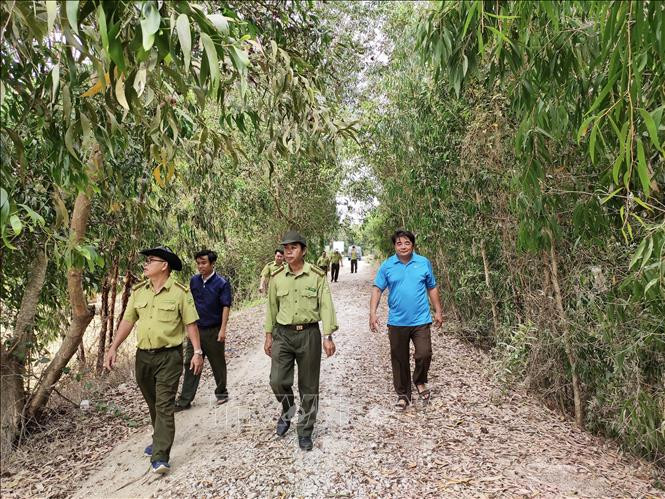 Cán bộ Chi Cục Kiểm lâm tỉnh An Giang kiểm tra công tác phòng, chóng cháy rừng tràm trên địa bàn huyện Tri Tôn. Ảnh: Thanh Sang-TTXVN