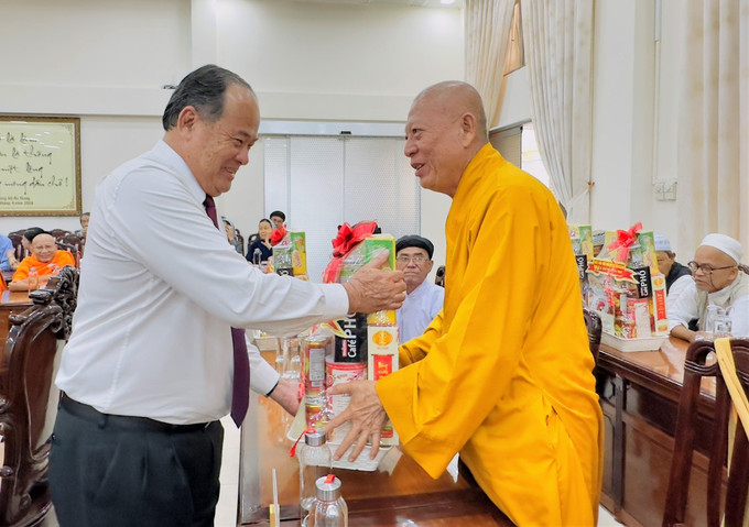 Chủ tịch UBND tỉnh An Giang Nguyễn Thanh Bình tặng quà xuân cho đại diện các tôn giáo tại buổi họp mặt. Ảnh: Thanh Sang -TTXVN