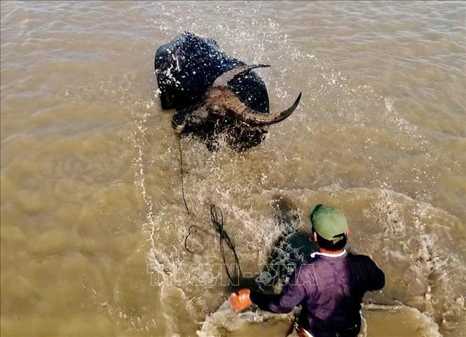 Cưỡi trâu vượt đồng nước nổi mênh mông. Ảnh: Cồng Mạo-TTXVN
