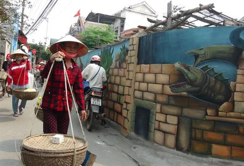 | Những bức tranh 3D làm đẹp thêm con đường quê. Ảnh: Đức Thọ - TTXVN |