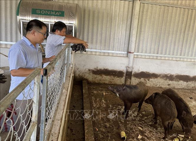 Mô hình chăn nuôi lợn rừng lai theo hướng hữu cơ của gia đình anh Nguyễn Đăng Vương. Ảnh: Thanh Thủy-TTXVN