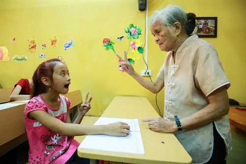 | Đều đặn một tuần 6 buổi, bà Nam đến với lớp học đặc biệt của mình, vừa dạy dỗ vừa là nơi để sẻ chia đồng cảm giúp những trẻ em khuyết tật có thêm niềm tin vào cuộc sống. (Ảnh: Minh Sơn/Vietnam+) |