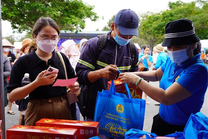 Liên đoàn Lao động tỉnh Bà Rịa-Vũng Tàu tặng 1.000 phần quà tại Gian hàng 0 đồng tại Chương trình “Chợ Tết Công đoàn”. Ảnh: Huỳnh Ngọc Sơn - TTXVN