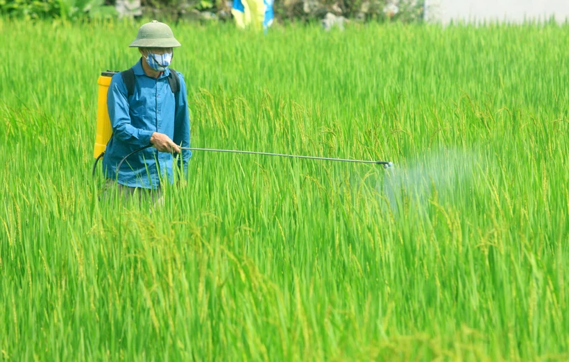 Nông dân huyện Vũ Thư (Thái Bình) phun thuốc phòng trừ sâu bệnh trên lúa. Ảnh: Thế Duyệt – TTXVN