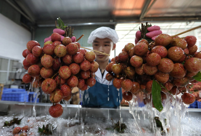 Dây chuyền sơ chế, chế biến vải thiều xuất khẩu tại Công ty CP XNK thực phẩm Toàn Cầu. Ảnh: Danh Lam – TTXVN