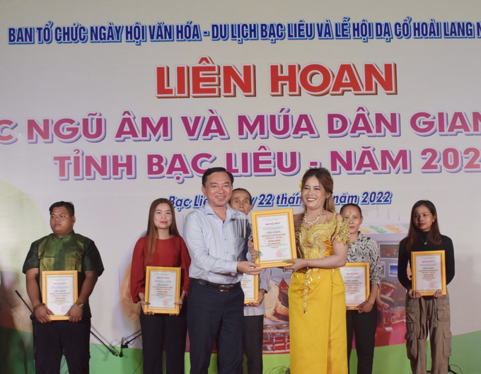 Ban tổ chức trao giải cho các đội đạt giải cao tại Liên hoan nhạc Ngũ âm và Múa dân gian Khmer tỉnh Bạc Liêu năm 2022. Ảnh: Nhật Bình - TTXVN