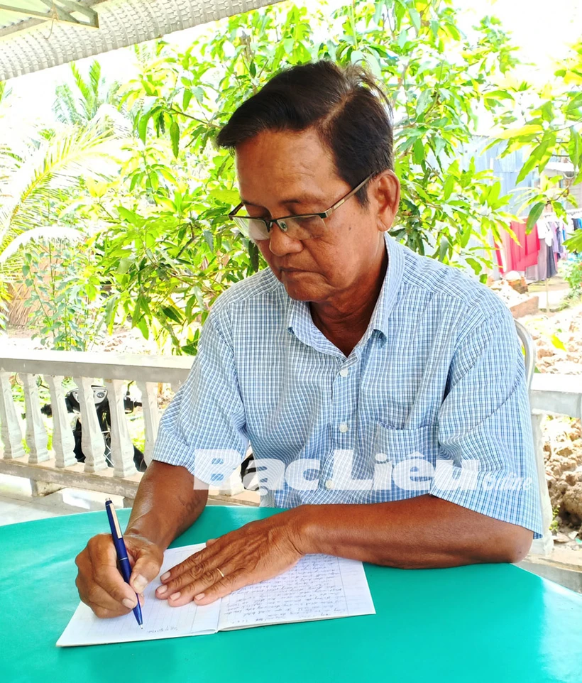 Ông Thạch Cưng soạn thảo nội dung để tuyên truyền cho đồng bào Khmer. Ảnh: baobaclieu.vn