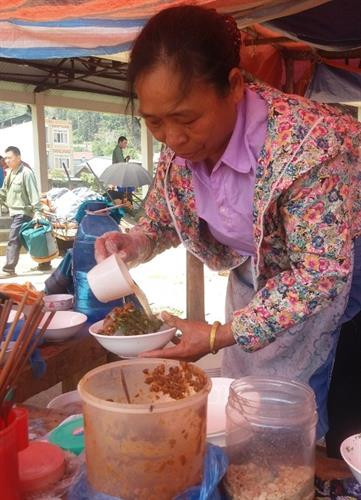 Giữa không khí tập nập của phiên chợ vùng cao, chúng tôi cũng tìm được cho mình chỗ ngồi trong quán bán phở chua của bà Lù Thị Khương, dân tộc Nùng ở thị trấn Mường Khương. Đã bao năm bán đặc sản phở chua, trước đây bà Khương bán bánh đúc bột đao chủ yếu phục vụ bà con đồng bào dân tộc thiểu số ở các xã vùng cao xuống chơi chợ, mua sắm và thưởng thức khi đã quá trưa. Nhưng giờ đây, món bánh đúc bột đao của người Nùng lại trở thành ẩm thực độc đáo hấp dẫn khách du lịch khi trải nghiệm chợ phiên Mường Khương. Bà Khương cùng nhiều gia đình bán hàng ăn trong chợ phiên này đều bán món bánh đúc cùng với phở chua để phục vụ khách đến chợ.