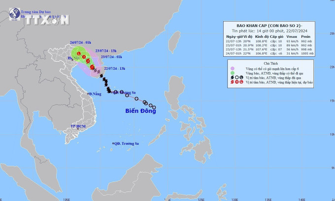 Nhận định về diễn biến bão số 2, chiều 22/7, Trưởng phòng Dự báo thời tiết, Trung tâm Dự báo khí tượng thủy văn Quốc gia Nguyễn Văn Hưởng cho biết, lúc 13 giờ ngày 22/7, vị trí tâm bão ở vào khoảng 20 độ Vĩ Bắc; 108,8 độ Kinh Đông, trên vùng biển phía Đông của khu vực Bắc vịnh Bắc Bộ, cách đảo Bạch Long Vĩ khoảng 120 km về phía Đông.