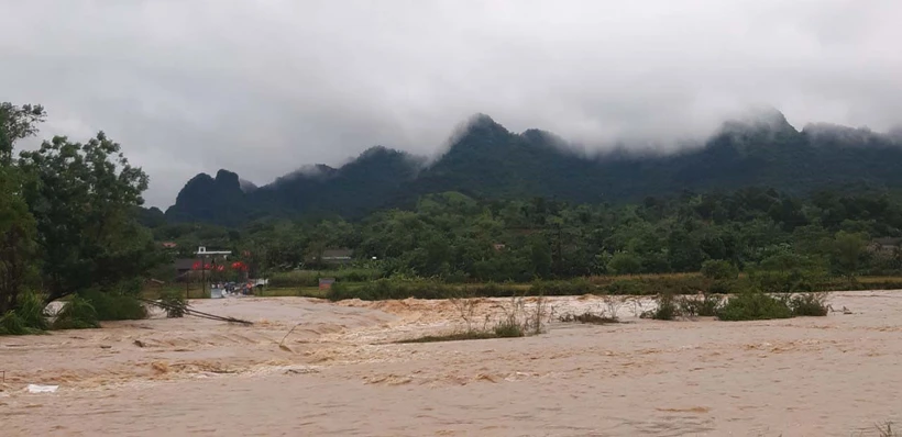 Tại đập tràn Khe Moi, xã Lục Dạ, huyện Con Cuông, nước dâng cao chia cắt 2 bên, không thể qua lại. Ảnh: TTXVN