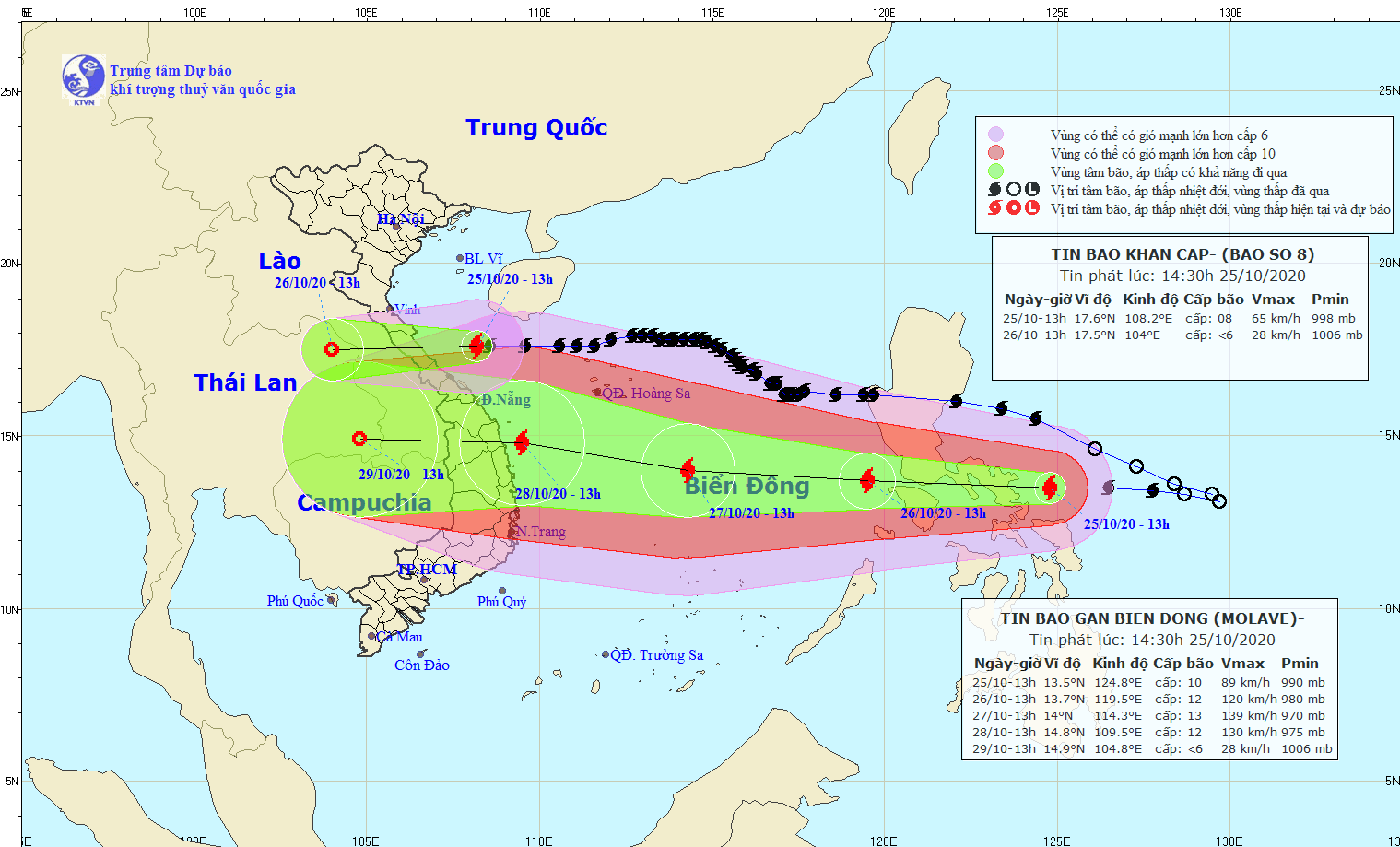 Về diễn biến bão số 9, đến 7 giờ ngày 25/10, vị trí tâm bão ở cách bờ biển miền Trung Philippines khoảng 230 km về phía Đông. Sức gió mạnh nhất vùng gần tâm bão mạnh cấp 9 (75-90 km/giờ), giật cấp 11.