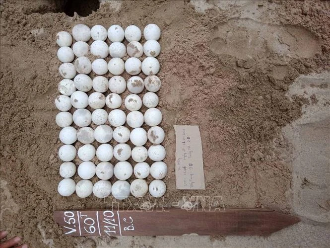 Trứng tại 1/18 bãi biển thuộc Vườn quốc gia Côn Đảo, tổ trứng rùa được ghi nhận rùa đẻ vào ngày 11/10/2021 với số lượng 90 trứng trong đó có 60 trứng tốt. Ảnh: TTXVN phát