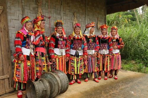 | Các cô gái Lô Lô trong trang phục váy áo sặc sỡ chuẩn bị trống đồng cho lễ cúng tổ tiên. Ảnh: Nguyên Thanh |
