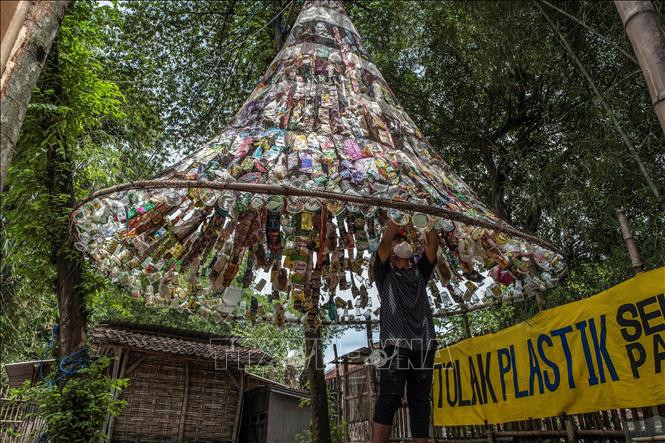 Các nhà bảo vệ môi trường lắp ráp các loại rác thải nhựa làm viện bảo tàng tại Gresik ở phía Đông đảo Java của Indonesia. Ảnh: AFP/TTXVN