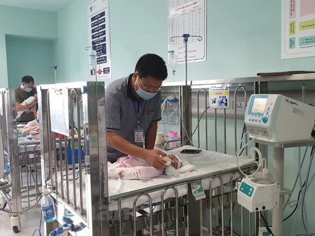 Một trẻ sơ sinh đang phải thở máy sau khi mắc virus hợp bào hô hấp. Ảnh: Vietnam+