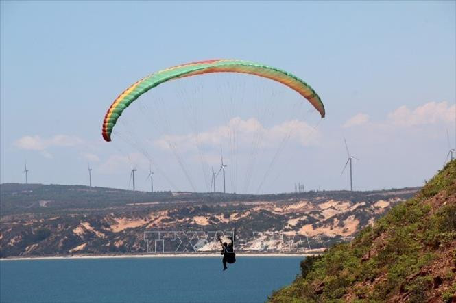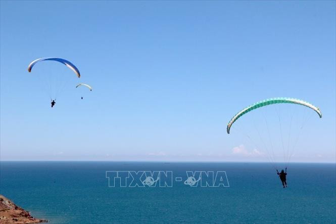 Với trò dù lượn mạo hiểm, người chơi sẽ được ngắm nhìn cảnh núi và biển tuyệt vời bằng góc nhìn trên cao. Ảnh: Nguyễn Thanh - TTXVN