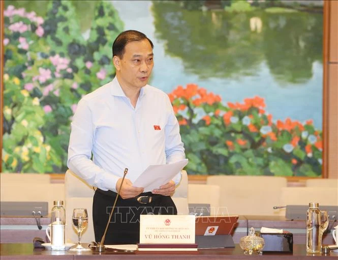 Chủ nhiệm Ủy ban Kinh tế của Quốc hội Vũ Hồng Thanh trình bày Báo cáo thẩm tra về việc điều chỉnh chủ trương đầu tư Dự án xây dựng một số đoạn đường bộ cao tốc trên tuyến Bắc - Nam phía Đông giai đoạn 2017-2020. Ảnh: Trọng Đức - TTXVN
