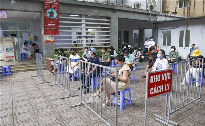 Những người làm việc tại tòa nhà T&T Group chờ lấy mẫu xét nghiệm. Ảnh: Tuấn Đức - TTXVN