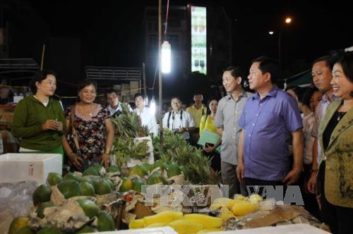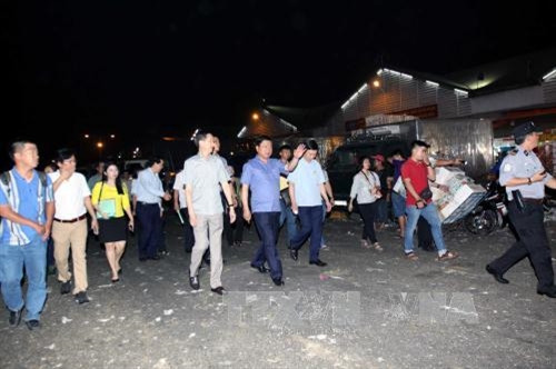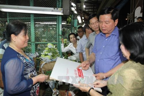 Bí thư Thành ủy Đinh La Thăng thị sát tại chợ đầu mối Hóc Môn. Ảnh: Thanh Vũ-TTXVN