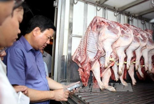 Bí thư Thành ủy Đinh La Thăng tìm hiểu việc truy xuất nguồn gốc thịt lợn kinh doanh tại chợ đầu mối Hóc Môn. Ảnh: Thanh Vũ-TTXVN