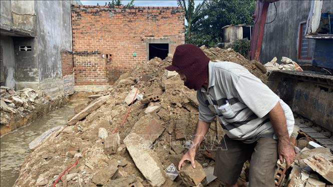 Ông Nguyễn Văn Châu, ở thôn Tùng Giản, xã Phước Hòa, huyện Tuy Phước bắt đầu dọn dẹp, xây dựng lại nhà cửa. Ảnh: Tường Quân - TTXVN