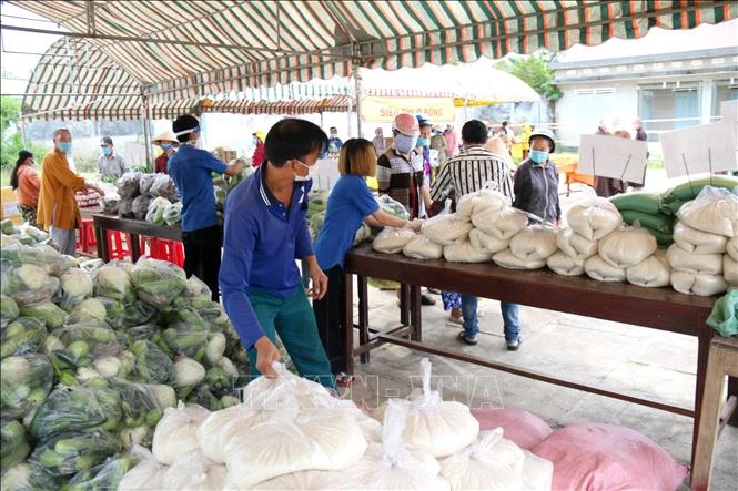 “Phiên chợ 0 đồng” với đa dạng nhu yếu phẩm phục vụ người dân ở Bình Thuận. Ảnh: Nguyễn Thanh - TTXVN