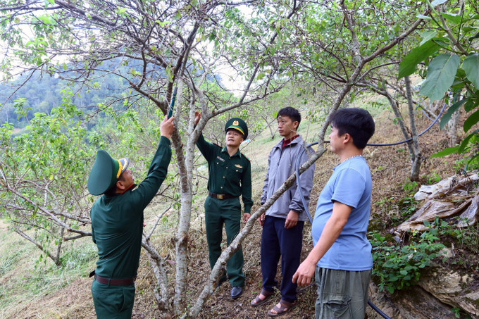 Cán bộ, chiến sĩ Đồn Biên phòng Chiềng Tương hướng dẫn người dân ở bản Pa Kha 1, xã Chiềng Tương cách chăm sóc vườn mận. Ảnh: Quang Quyết