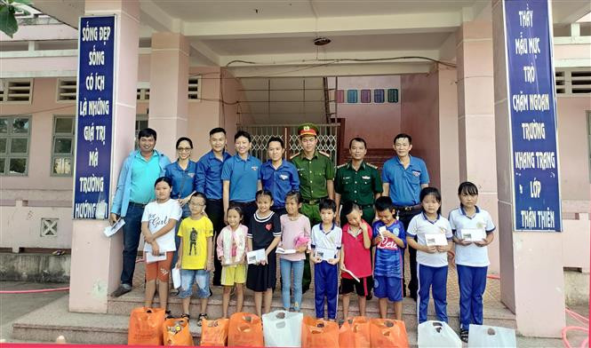 Bộ đội Biên phòng tỉnh Sóc Trăng tặng quà cho học sinh nghèo vùng ven biển. Ảnh: Trung Hiếu - TTXVN