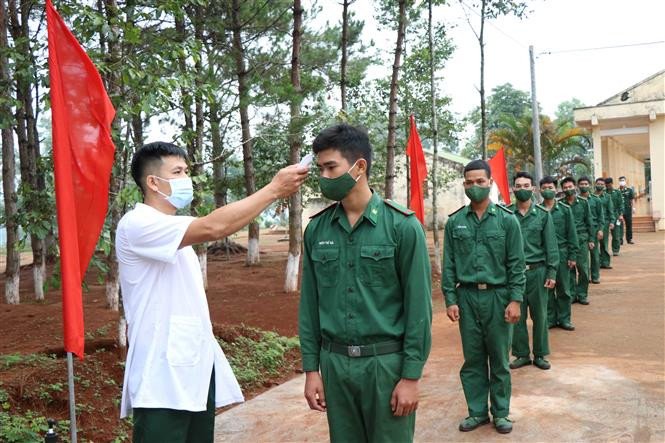 Lực lượng y tế kiếm tra thân nhiệt các chiến sĩ tham gia bầu cử nhằm đảm bảo phòng, chống dịch COVID-19. Ảnh: Nguyên Dung - TTXVN