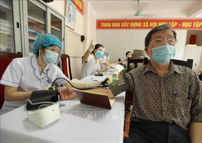Khám sàng lọc trước khi tiêm cho người thuộc diện gia đình chính sách của phường Nghĩa Đô. Ảnh: Vũ Sinh - TTXVN