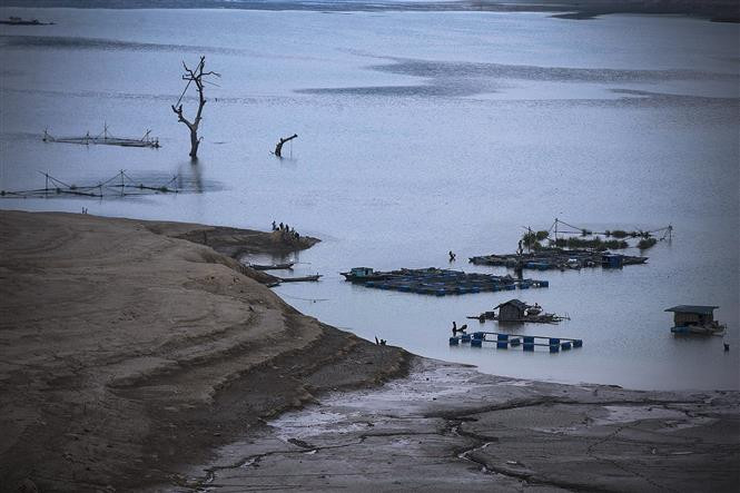 Một khúc ven hồ Hòa Bình cạn nước và các khung lồng nuôi cá bị mắc cạn tại địa phận xã Vầy Nưa, huyện Đà Bắc (Hòa Bình). Ảnh: Trọng Đạt - TTXVN