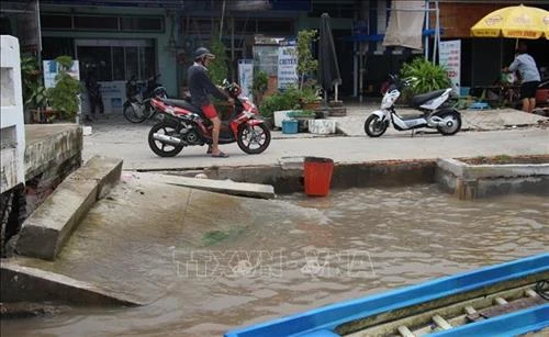 | Công trình chống sạt lở cho khu vực chợ Đất Mũi đã bị sạt lở. Ảnh: Huỳnh Thế Anh - TTXVN |