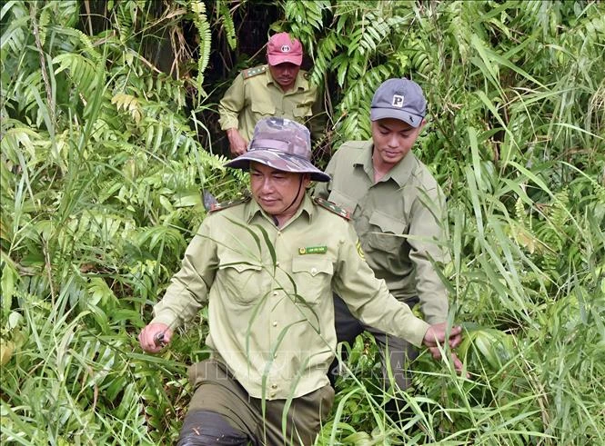 Các lực lượng bảo vệ rừng thường xuyên đi tuần tra, kiểm soát tại các khu vực rừng mình quản lý. Ảnh: Huỳnh Anh - TTXVN
