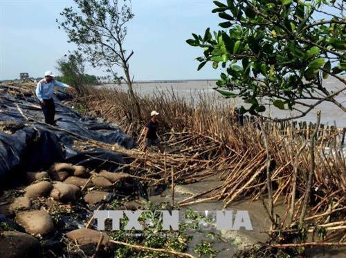 | Chủ đầu tư và đơn vị thi công tiến hành khảo sát nắm tình hình sạt lở tại huyện Ngọc Hiển, tỉnh Cà Mau để chọn giải pháp đầu tư công trình kè bảo vệ bờ biển phù hợp. Ảnh: TTXVN phát |