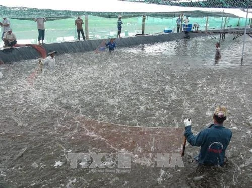 | Thu hoạch tôm nuôi siêu thâm canh tại Cà Mau. Ảnh: Huỳnh Thế Anh - TTXVN |