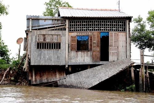 | Nhà dân ven sông Năm Căn, Cà Mau bị sụp lún do sạt lở đất. Ảnh: Kim Há-TTXVN |