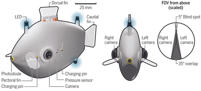 Cá robot có tên "Bluebot", được trang bị 2 camera ở mắt và 3 đèn LED xanh trên thân. Chúng sử dụng những chiếc vây nhỏ thay vì chân vịt, nhờ đó chuyển động được dễ dàng và linh hoạt hơn so với các thiết bị không người lái ở dưới nước khác. Nhờ đôi mắt camera phát hiện ánh sáng đèn LED và một thuật toán giúp xác định khoảng cách, phương hướng, khi thả xuống dưới bể nước, những cá robot này tự động bơi theo vòng tròn xung quanh một điểm và lặp lại những chuyển động mà không cần sự tác động của bên ngoài.