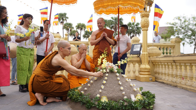 Các phật tử thực hiện nghi thức tâm linh tại không gian chùa Khmer. Ảnh: Hoàng Tâm