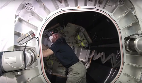 | Nhà du hành vũ trụ người Mỹ Jeff Williams mở cửa nhà bơm hơi BEAM. AFP/TTXVN |