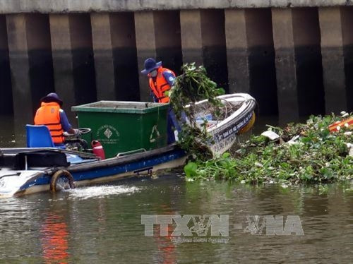 | Đoàn viên ra quân vớt rác trên kênh Nhiêu Lộc tại địa bàn phường 2 – quận Phú Nhuận. Ảnh: Hoàng Hải -TTXVN |