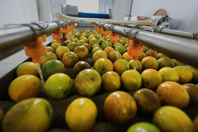 Cam sục rửa ozone và chọn lọc kỹ đảm bảo chất lượng quả cam tươi khi đến tay người tiêu dùng. Ảnh: Trọng Đạt - TTXVN